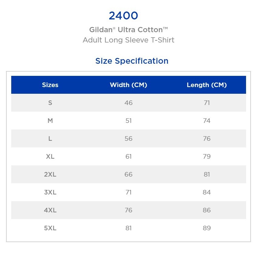 Gildan Ultra Cotton Adult Long Sleeve T Shirt Size Chart 2400