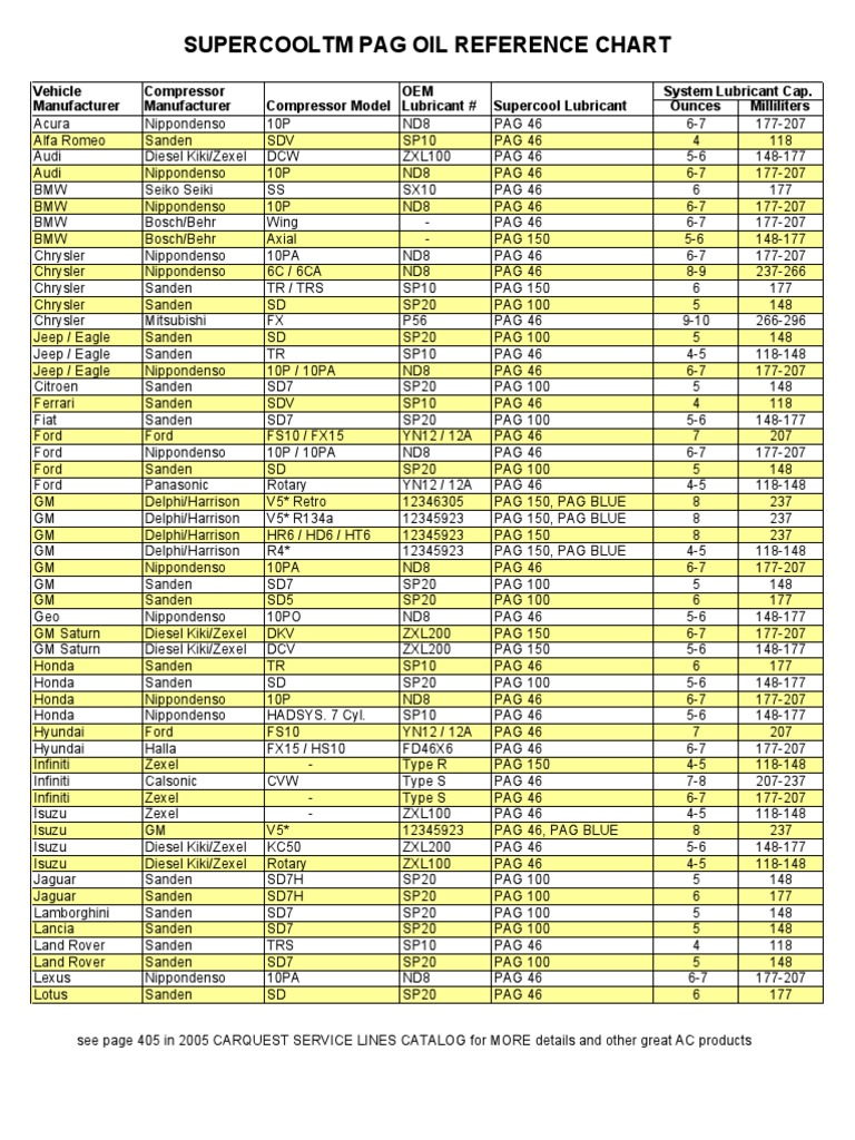 Ac Compressor Pag Oil Application Chart Air Conditioning Oil